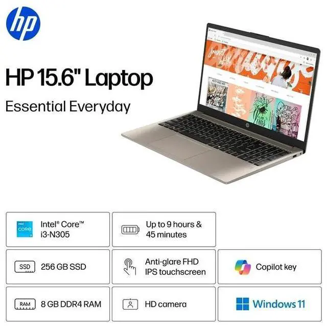 The HP 15 inch FHD Laptop packs in the reliable processing power of an Intel Core processor, plus ample SSD storage, powerful graphics, and design with recycled materials to give you the power and capacity to do more. Chat with ease knowing you have HD resolution with a camera you can close when not in use, keeping you safe online. Stay in your flow effortlessly with this computer's long-lasting battery life and HP Fast Charge, and a crisp quality 85% screen-to-body ratio touchscreen display.