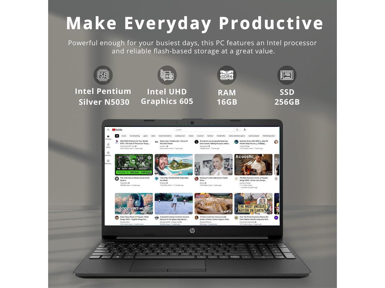 HP 15.6 HD Student Laptop, Intel Pentium Silver N5030, 16GB RAM, 256GB SSD, Intel UHD Graphics, HD Webcam, Numpad, Wi-Fi 5, Bluetooth, 1 Year Office 365, Win 11, Black, 32GB USB Card