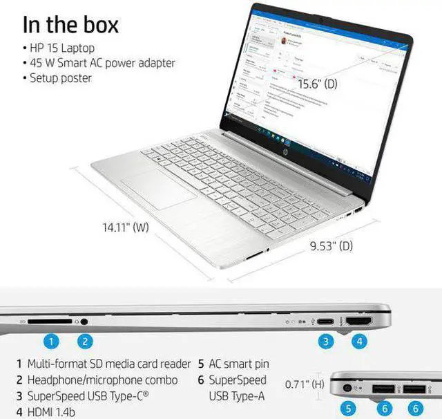 External ports: 1 SuperSpeed USB Type-C® 5Gbps signaling rate; 2 SuperSpeed USB Type-A 5Gbps signaling rate; 1 HDMI 1.4 b; 1 AC smart pin; 1 headphone/microphone combo