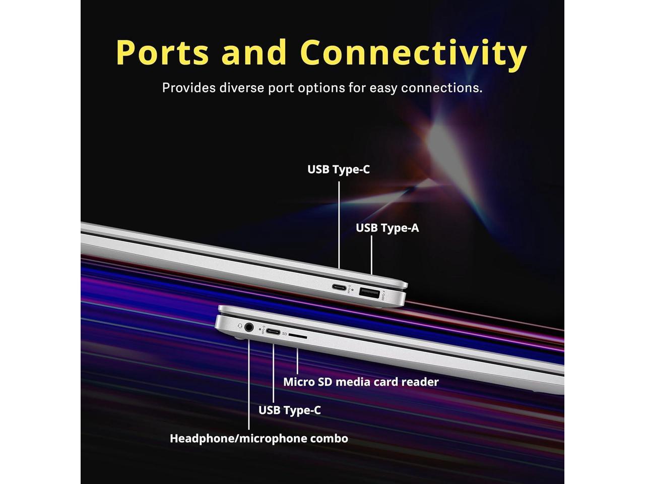 - Chrome OSPorts1 x USB-A 3.1, 2 x USB-C 3.1, 1x Headphone Jack, 1x Media Card Reader. Wifi 6, Bluetooth. HD Audio with stereo speakers.