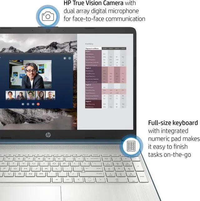 HP True Vision Camera with noise reduction, integrated numeric keypad, HP QuickDrop wireless file sharing"