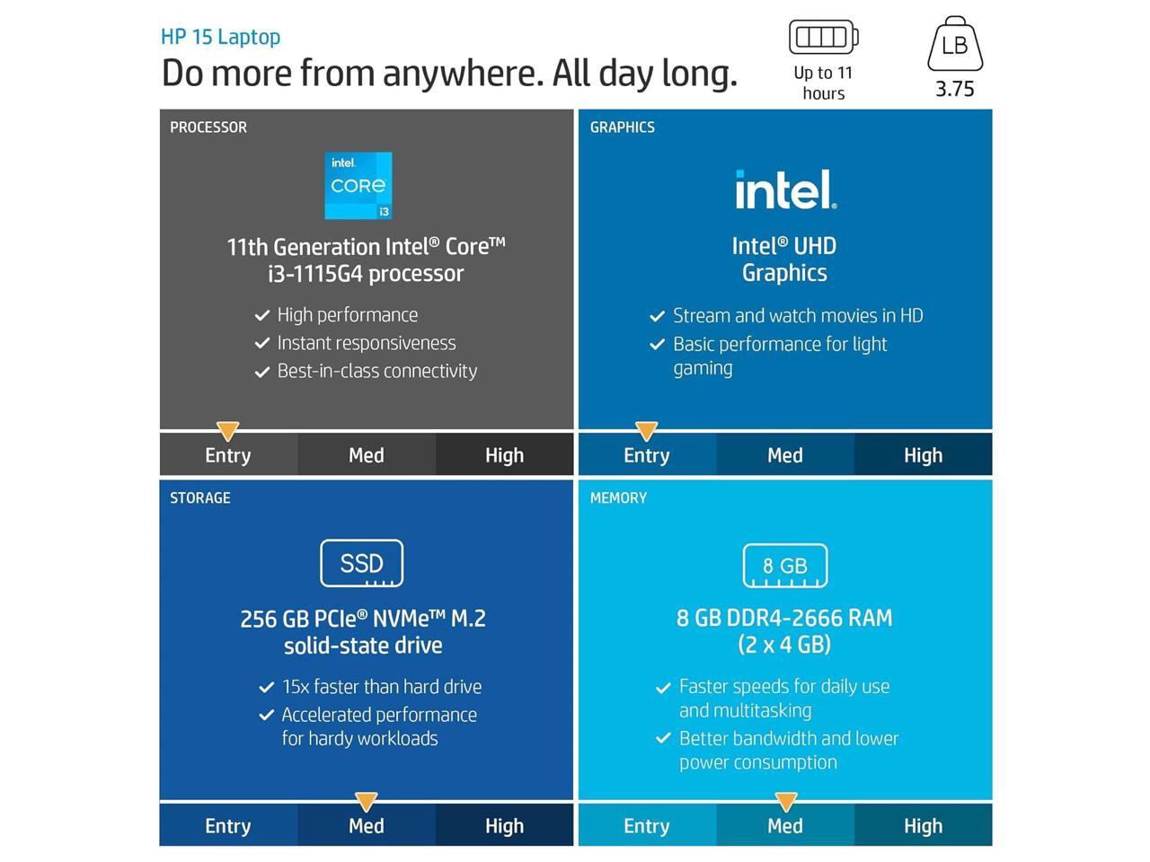 - 11th Gen Intel Core i3-1115G4 - 3 GHz base frequency, up to 4.1 GHz with Intel Turbo Boost Technology, The 11th gen dual-core laptop brings the perfect combination of features to make you unstoppable