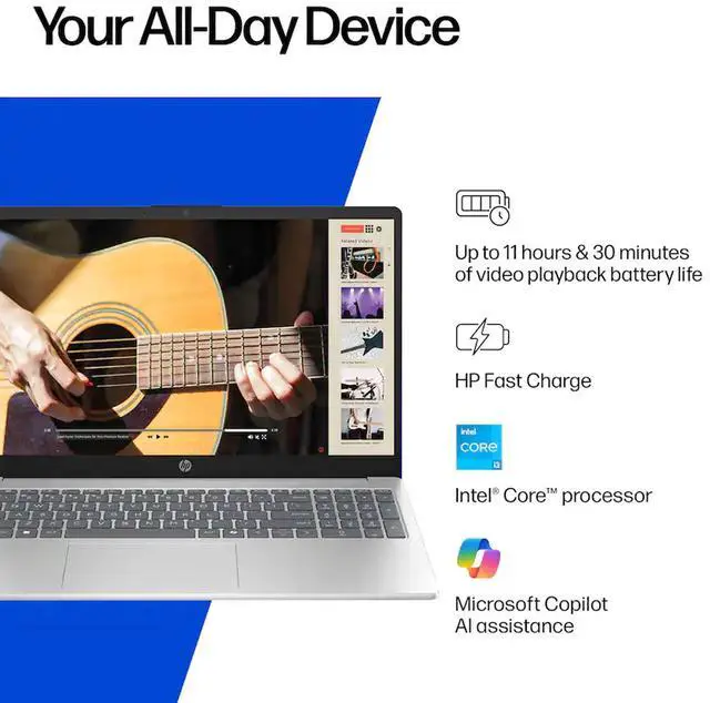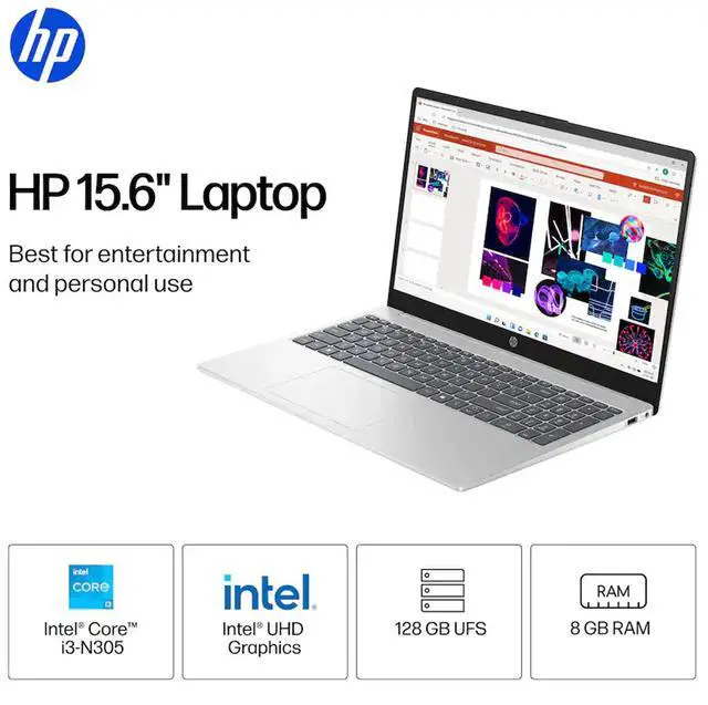 HP 15.6" Laptop - Intel Core i3 N305 2023 - 8GB Memory, 128GB UFS - Natural SilverBuilt for everyday life, this laptop combines dependable performance with Microsoft Copilot AI assistance to help you work smarter and find answers faster. Dual-array mics with AI noise reduction and an HD camera keep your video calls clear, while privacy features like a one-touch camera shutter and mic mute put you in control.