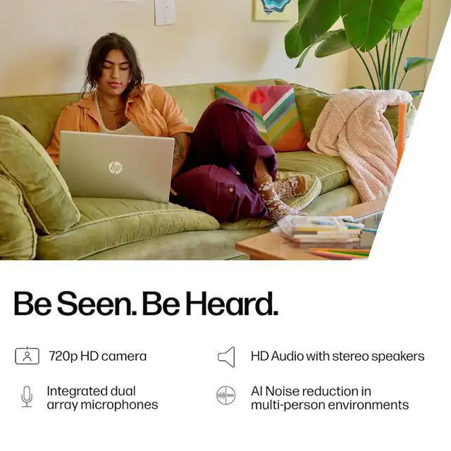 Enjoy clearer team conversations with AI noise reduction. Using artificial intelligence, it filters out background noise in multi-person environments and captures multidirectional sound with spatial awareness. - HP True Vision HD Camera with Microphone Mute and Camera Shutter