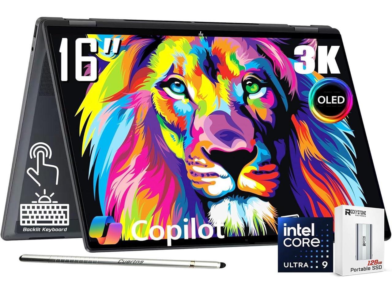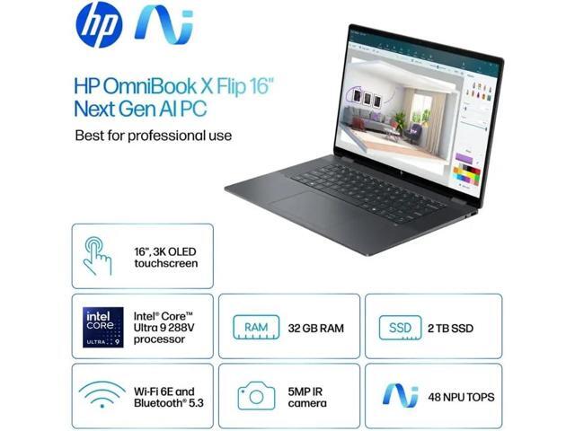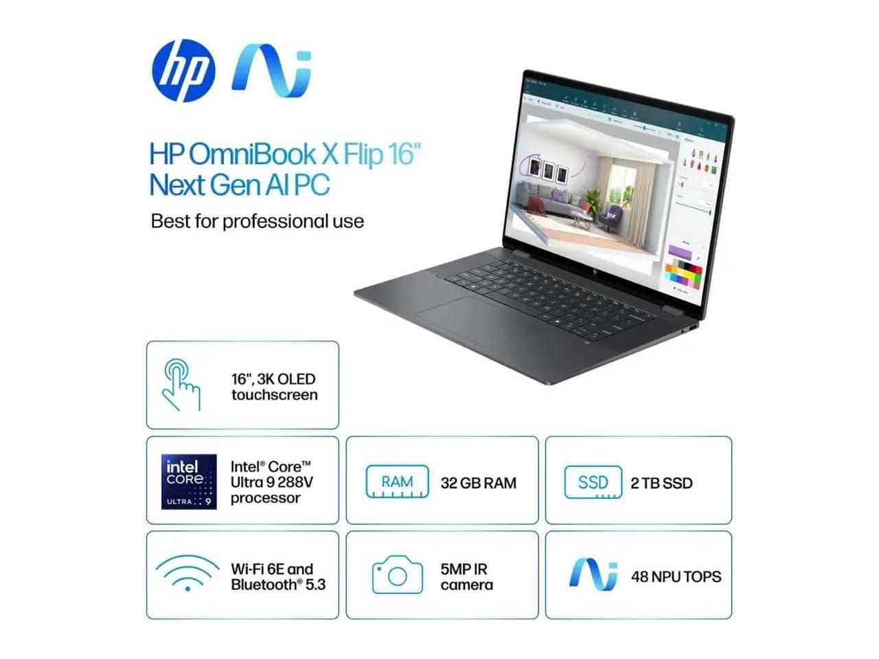 HP OmniBook X Flip 2-in-1 Laptop | Copilot+ AI | 16" 3K OLED 120Hz Touch (100% DCI-P3) | Intel 8-core Ultra 9 288V Up to 48 Tops | 32GB DDR5 2TB SSD | Backlit Poly Studio Win11 Home w/128GB PSD