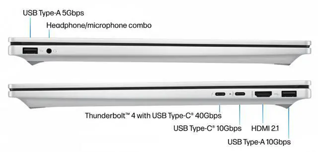 - 1x Thunderbolt 4 with USB Type-C® 40Gbps signaling rate (USB Power Delivery, DisplayPort 1.4, HP Sleep and Charge)