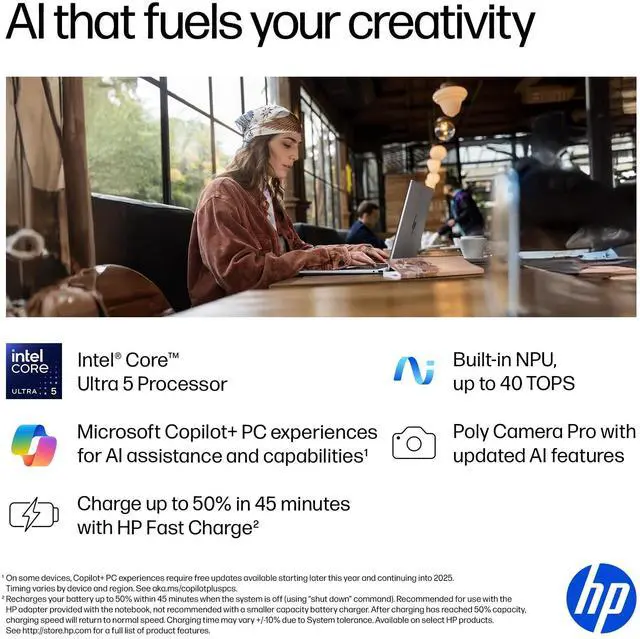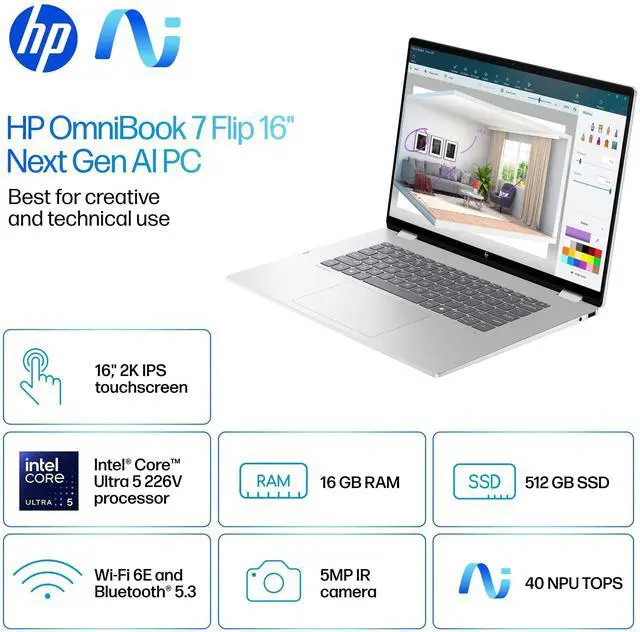 AI power, four modes, 16" display, and long-life batteryPerform and produce wherever you are with HP OmniBook 7 Flip 16" Next Gen AI PC, powered by AI and the latest Intel Core Ultra Processor. Flip the 16" touch display to find your favorite orientation and go all day and night with a fast-charging, long-life battery and Wi-Fi. Boosted by AI-powerAI power and generative AI apps keep data secure and enable work with or without an internet connection. Smooth streaming and soundSmooth streaming with Wi-Fi, a 5MP camera, AI noise reduction, and live streaming integration.