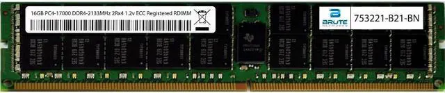 HP Compatible 753221-B21 - 16GB PC4-17000 DDR4-2133Mhz 2Rx4 1.2v Registered RDIMM 753221-B21-BN is a HP compatible 16GB PC4-17000 DDR4-2133Mhz 2Rx4 1.2v Registered RDIMM, equivalent to HP labeled PN#: 753221-B21. Brute Networks modules are all major brand (Samsung, SK Hynix, or Micron). This module is guaranteed compatible with your server, as well as guaranteed to maintain your factory warranty, since Brute Networks modules are from the same manufacturers HP uses for their OEM branded modules.