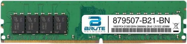 HP Compatible 879507-B21 - 16GB PC4-21300 DDR4-2666MHz 2Rx8 1.2V ECC UDIMM 879507-B21-BN is a HP compatible 16GB PC4-21300 DDR4-2666MHz 2Rx8 1.2V ECC UDIMM, equivalent to HP labeled PN#: 879507-B21. Brute Networks modules are all major brand (Samsung, SK Hynix, or Micron). This module is guaranteed compatible with your computer, as well as guaranteed to maintain your factory warranty, since Brute Networks modules are from the same manufacturers HP uses for their OEM branded modules.