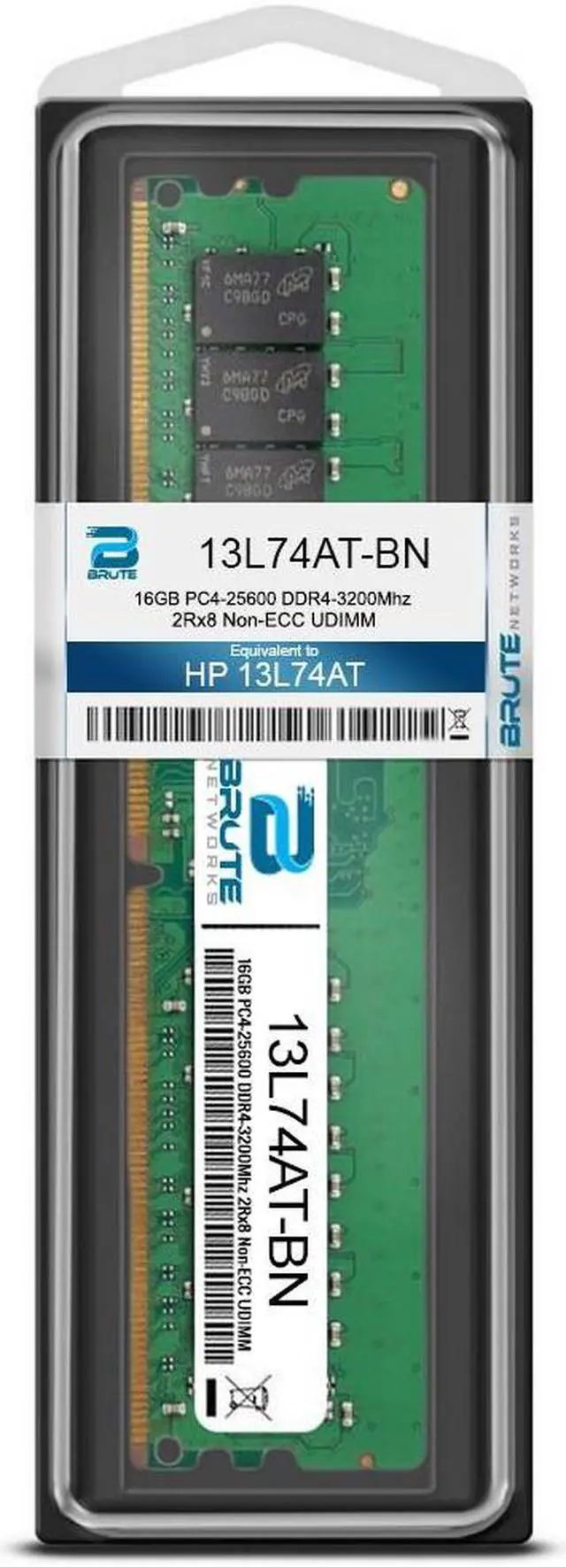 Brute Networks 13L74AT-BN is an OEM compatible 16GB PC4-25600 DDR4-3200Mhz 2Rx8 Non-ECC UDIMM, equivalent to HP labeled PN#: 13L74AT