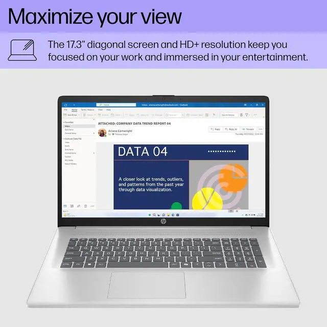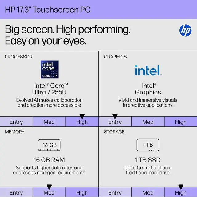 Screen: 17.3" diagonal, HD+ (1600 x 900), touch, anti-glare, 250 nits