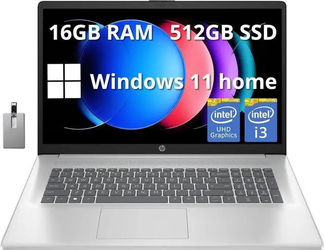 HP 17.3" Full HD Laptop, Intel Core i3 1215U Processor, 16GB DDR4 RAM, 512GB PCIe SSD, Intel UHD Graphics, Wi-Fi 5, HD Camera, Windows 11 Home, Natural Silver, 32GB Hotface USB Card