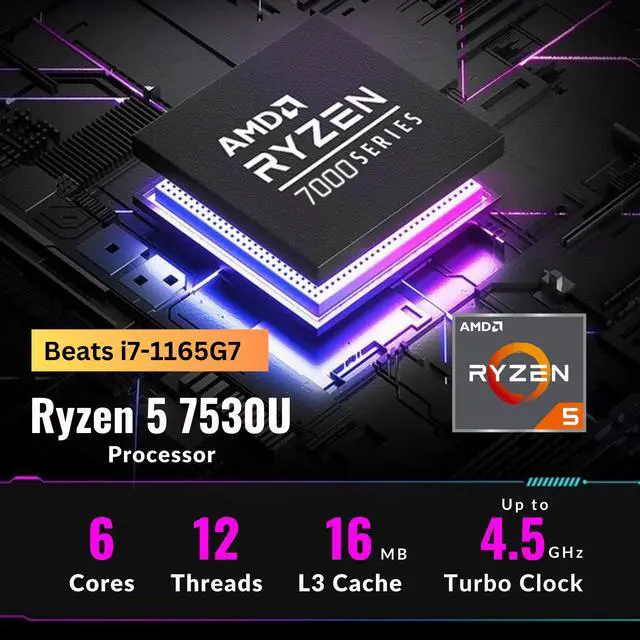 Processor: AMD Ryzen 5 7530U, 6 Cores, 12 threads, 16 MB L3 cache, up to 4.5GHz.