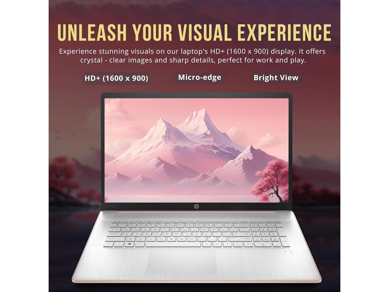 - HP 17.3" HD+ BrightView DisplayIndulge in enhanced productivity and entertainment pursuits with the captivating clarity and brilliance of a 17.3" diagonal HD+ (1600 x 900) display, sure to elevate your experiences.