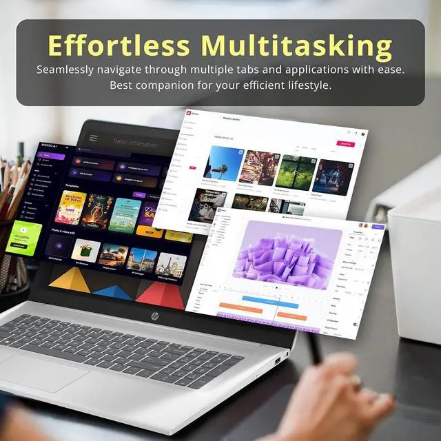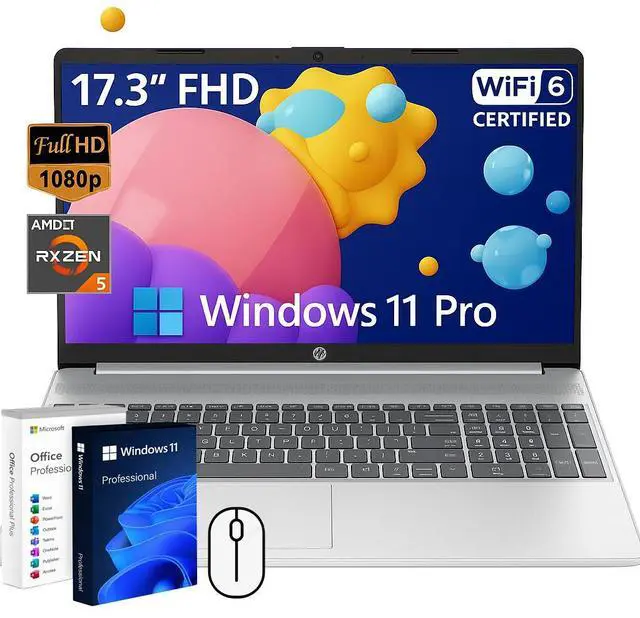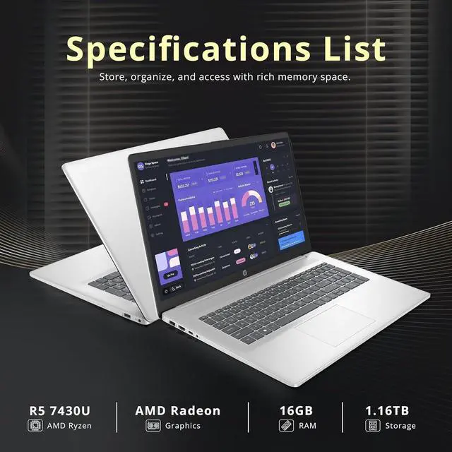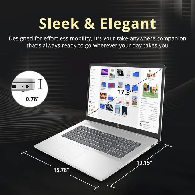 HP 17.3" FHD Notebook AMD Ryzen 5 7430U More screen, less footprint The HP 17.3 inch Laptop PC is about sustainability while blending performance and comfort. Purposefully designed See more and enjoy flicker-free images on a FHD IPS screen with a narrow bezel, and get comfy while you type with a new lift-hinge that elevates the keyboard. Performance you can trust Multitasking feels easy and fast with the performance of an AMD processor, powerful graphics, and speedy Wi-Fi technology. Store more of what you love with a lot of storage. Breathe easy Everyday computing made easy, with a wide array of comfort features like HP Fast Charge and an enlarged click pad.