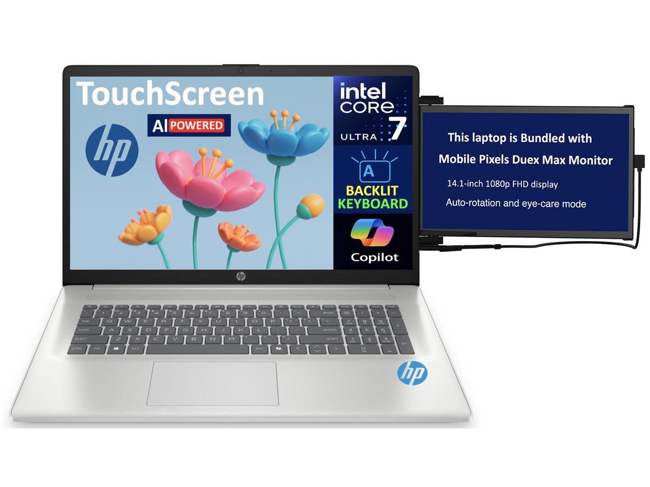HP 17 AI Powered Laptop 17.3" Touchscreen HD+ Display (Intel Ultra 7-255U, 16GB DDR5, 1TB SSD, Intel Graphics, Backlit KB, WiFi 6, Webcam, Bluetooth 5.2, Win 11 Home) w/Duex Max DS Monitor