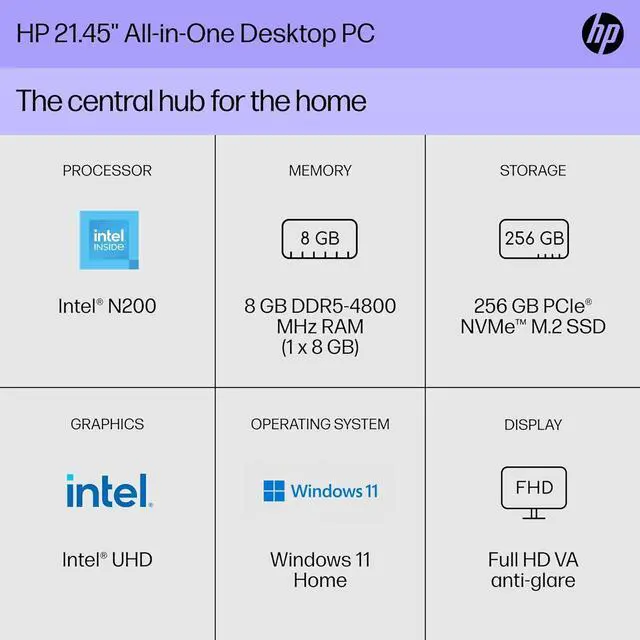 HP 22 inch All-in-One Desktop PC, FHD Display, Intel N200, 8 GB RAM, 256 GB SSD, Intel UHD Graphics, Windows 11 Home, 22-dg0012 (2024)