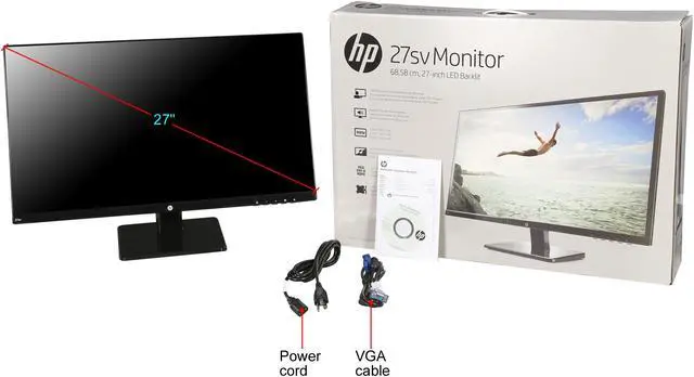 HP 27sv Black 27” IPS Frameless LCD/LED Monitor, 250 cd/m2 DCR 10,000,000:1 (1000:1), Built-in Speakers, VESA Mountable, HDMI DVI VGA