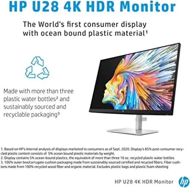 OverviewExperience the best quality while producing your best creative on this 28 4K HDR monitor. Whether you're creating for web, print, or photography, ensure your content is seen exactly as you intended. With factory color calibration, enjoy color accuracy you can count on. Now, you can always stay comfortable while working with height adjustability and swivel capabilities. Plus, youll always be keeping the environment in mind when designing with a display built with recycled ocean-bound plastics. On-screen controls; Low blue light mode; Anti-glareWhat's in the box? Monitor; DisplayPort cable; HDMI cable; USB Type-C cable; Warranty card; External power supplier; Product notice; AC power cableDisclaimers 4K content required to view full 4K images.