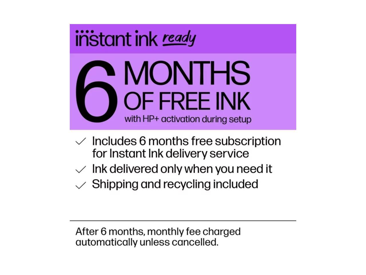 - 6 free months of Instant Ink subscription when you activate HP+ Print up to 700 pages a month. Ink ships to you automatically so you never run out. After 6 months, monthly fee applies unless cancelled, and you'll save up to 50% on ink.