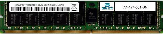 HP Compatible 774174-001 - 32GB PC4-17000 DDR4-2133Mhz 4Rx4 1.2v ECC LRDIMM 774174-001-BN is a HP compatible 32GB PC4-17000 DDR4-2133Mhz 4Rx4 1.2v ECC LRDIMM, equivalent to HP labeled PN#: 774174-001. Brute Networks modules are all major brand (Samsung, SK Hynix, or Micron). This module is guaranteed compatible with your server, as well as guaranteed to maintain your factory warranty, since Brute Networks modules are from the same manufacturers HP uses for their OEM branded modules.