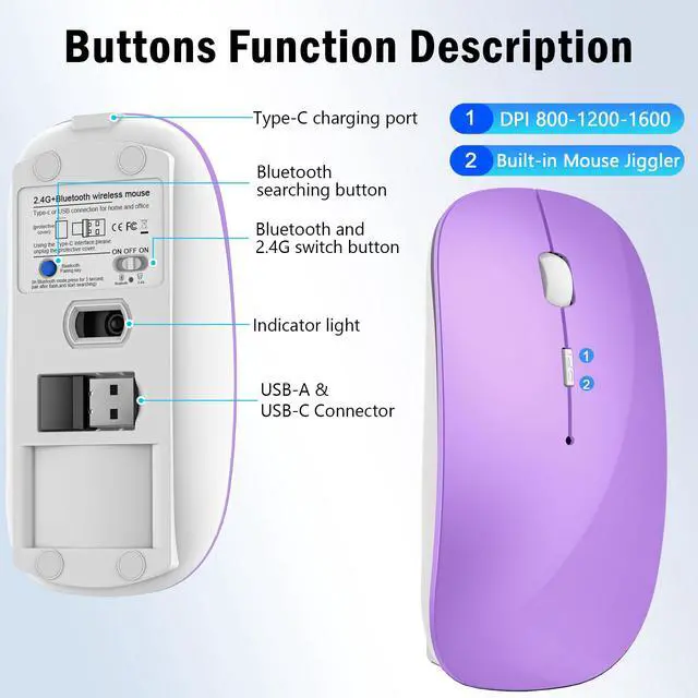 FYBC Wireless Mouse Bluetooth 5.2/3.0 & USB-A/Type-C Receiver with Jiggler Mode