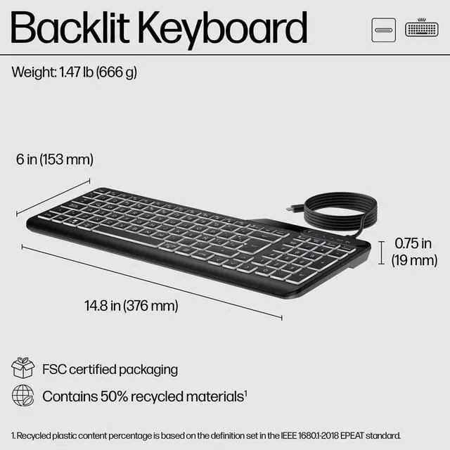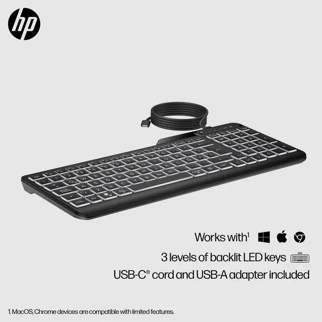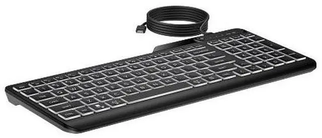 OverviewWith warm white illuminated keys, this ready-to-go keyboard never misses a beat. Plug into your device and grind away with quiet keys and three levels of backlit LED glow. Plus, skyrocket your productivity with 12 programmable keys. Work and play all day on the slim and sanitizable HP 400 Backlit Wired Keyboard. What's in the box? Wired keyboard; USB dongle; Quick start guide; Warranty card; USB Type-C® cableDisclaimers Select household wipes can be safely used up to 1, 000 wipes. See wipe manufacturers instructions for disinfecting and the HP cleaning guide for HP tested wipe solutions at How to Clean Your HP Device Whitepaper https: //h20195. www2. hp. com/v2/GetDocument. aspx? docname=4AA7-7610ENW Requires HP Accessory Center (HPAC) software. HPAC available for free download in Microsoft Store or Apple Store. Recycled plastic content percentage is based on the definition set in the IEEE 1680.1 -2018 EPEAT® standard.