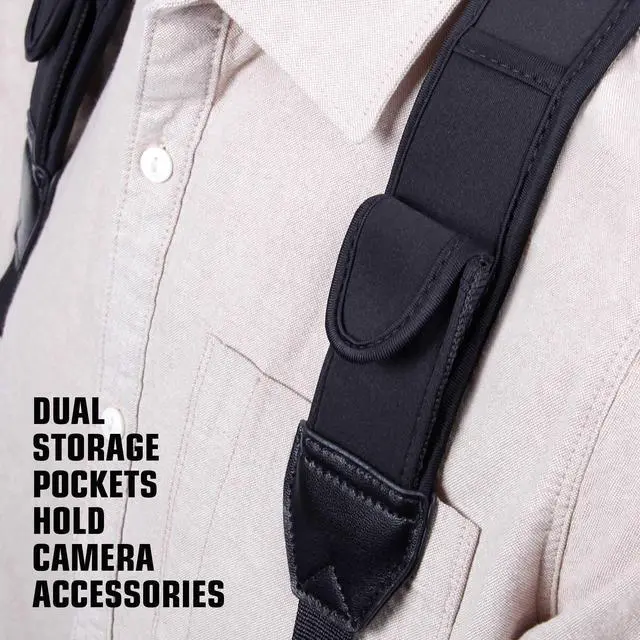 USA Gear Camera Harness Strap is constructed with padded neoprene, designed to offer extra strength and stretch for comfortable carrying during extended use. There's no more worrying about lugging around your DSLR camera. Get rid of the stress you can experience on long photo sessions and enjoy this lightweight and durable camera harness. It's the perfect camera accessory to take along with you on hikes, weddings or your next trip!