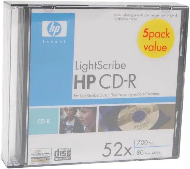 | Features | Tired of CD labels that eventually get sticky or peel off? Want to burn your own silkscreen-quality labels directly on CDs? Here's how: create labels with text, photos, and art on your PC, then use HP's exclusive LightScribe technology to transfer them to these discs.1 Each CD supplies 700MB of storage for your photos, music, videos, and data. When you finish writing a CD, just turn it over; the same drive burns the label. Jewel cases included. |