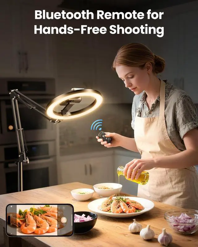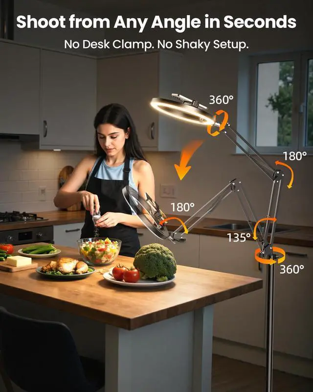 • Super Flexible & Shoot at Any Angle: The ultra-flexible arm on this overhead camera mount tilts, swivels, and extends in just 1 secondoffering wider lighting coverage than standard stands. Easily capture overhead cooking, angled tutorials, or full-table DIY without moving your setup