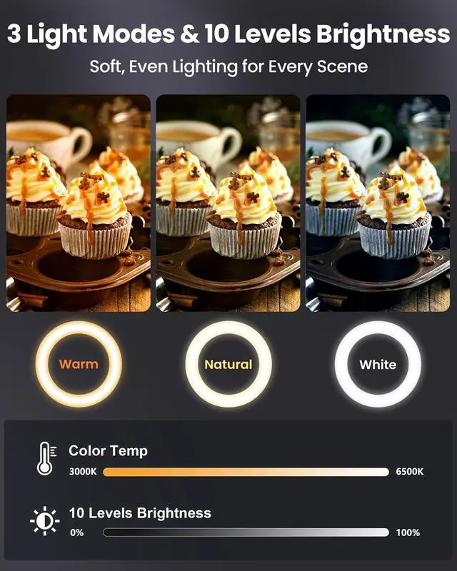• Pro-Quality Lighting with 30 Settings: Customize your lighting with 3 color modes (Warm, Natural, Cool), each with 10 brightness levels. A high CRI (>95) ensures vibrant, true-to-life colorsIt's a must have video equipment for YouTubers, TikTokers, and content creators