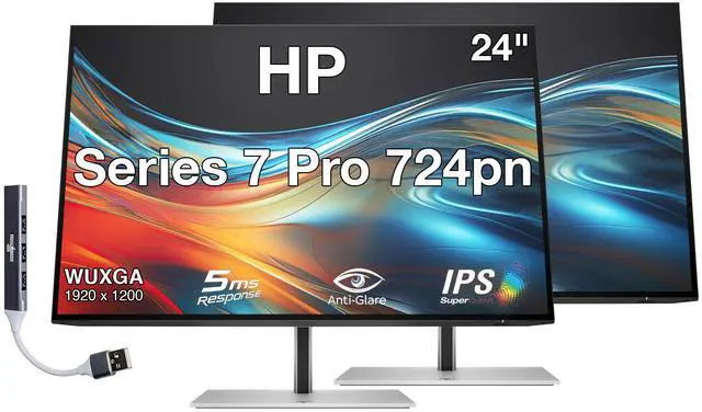 HP Series 7 Pro 724pn 24" WUXGA IPS Monitor With 5ms Response Time, Anti Glare, Flicker Free, VESA Mount (100mm), Displayport, HDMI & Dockztorm USB Port Expander, Black/Silver (8X534AA#ABA) 2 Pack