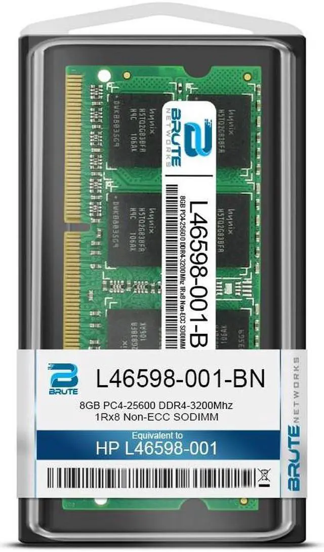 Brute Networks L46598-001-BN is an OEM compatible 8GB PC4-25600 DDR4-3200Mhz 1Rx8 Non-ECC SODIMM, equivalent to HP labeled PN#: L46598-001