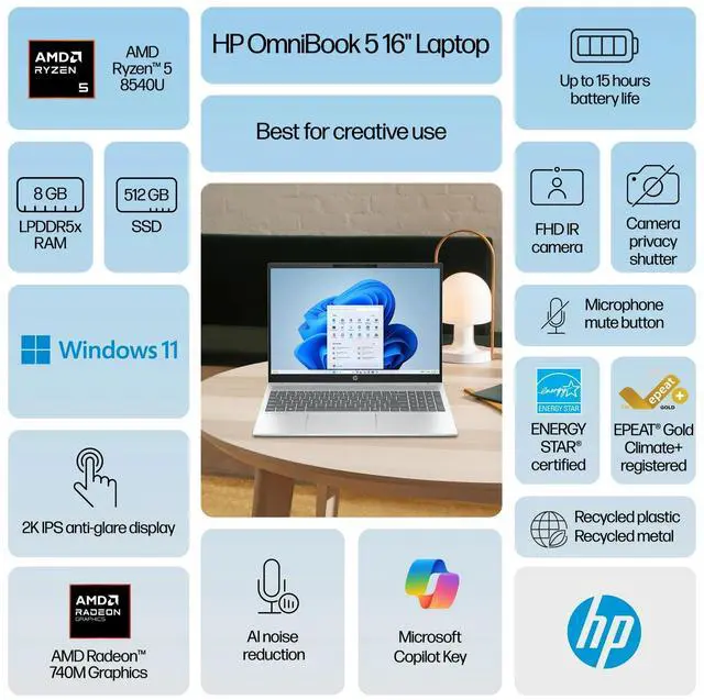 The HP OmniBook 5 16 is a premium AI-enhanced laptop designed for productivity, portability, and modern performance. Powered by the latest Intel Core Ultra 7 255U processor with built-in Intel AI Boost, it delivers smooth multitasking, efficient power usage, and accelerated AI features for creative and work applications.