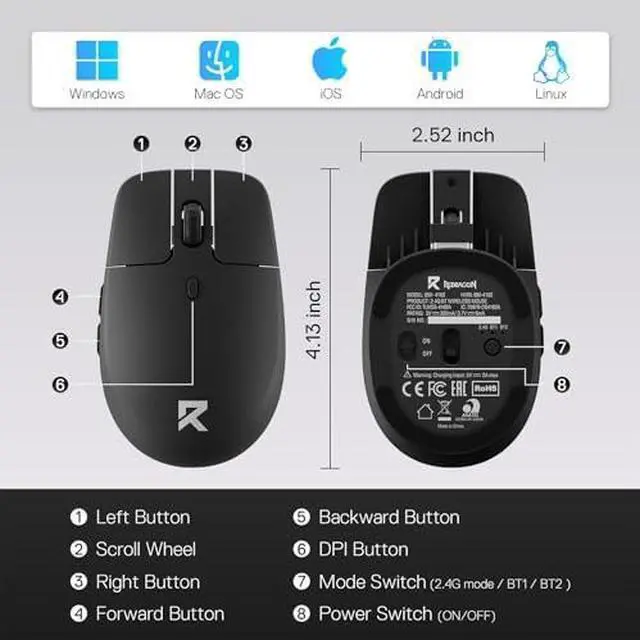 Redragon BM4162 Wireless Mouse, Dual-Mode 2.4GHz/BT Mouse, Lightweight Floating Button Design, Silent Click, 5 Adjustable DPI up to 4000, Ergonomic Compact Mouse for Mac & Windows