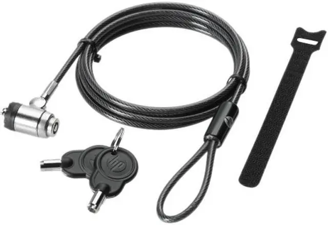 The HP Keyed Cable Lock is designed to be used with industry standard lock slots like the type found on a laptop, docking station, desktop PC, flat panel display, printer or projector. Secure your valuable IT hardware with this lock that consists of a 6.00' (1.83 m) vinyl-coated, galvanized aircraft-grade steel cable that loops around any secure object and then attaches to the computer or device you want to lock. The lock features a push-button locking mechanism and a unique key (including a spare key) to unlock the cable.