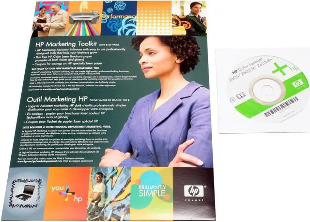 Print drivers (HP PCL 6, HP PostScript Level 3 emulation), Toolbox configuration utility, HP Photosmart Premier, HP Marketing Assistant and installation software on CD-ROM