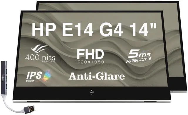 HP E14 G4 14" FHD IPS Monitor with 5ms Response Time, Anti-Glare, Flicker Free, 400 nits Brightness, USB-C & Dockztorm USB Port Expander, Silver Color (1B065AA#AC3) 2 Pack