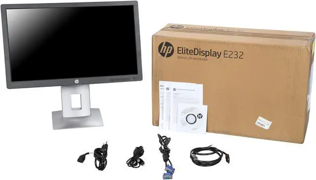 Work smart and comfortably with the HP EliteDisplay E232 58,4 cm (23â€) Monitor, a large-screen Full HD IPS display with Elite-class presentation features and ergonomic adjustability for everything you do every day.Put every detail on display.- Enjoy sharp Full HD resolution for all your projects and collaborate easily with colleagues around the room with 178-degree viewing angles from IPS technology. The large 58,4 cm (23â€) diagonal screen gives you plenty of room for your open applications.Find your perfect fit.- Create the view that’s right for you and boost your productivity with adjustable tilt and swivel and an impressive 150 mm height adjustment range. Use pivot rotation to customize portrait or landscape views.Convenient connections.- Connect to your choice of PC or device with HDMI, DisplayPort, VGA, and USB inputs. Keep your frequently-used devices right where you need them with USB connections at the display.A compact, efficient PC-a