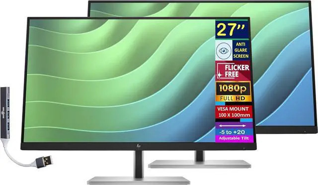 HP E27 G5 27" FHD IPS Monitor with 5ms Response Time, Anti-Glare, Flicker Free, 300 nits Brightness, VESA mount (100 mm), HDMI & Dockztorm USB Port Expander, Black/Silver Color (6N4E2AA#ABA) 2 Pack