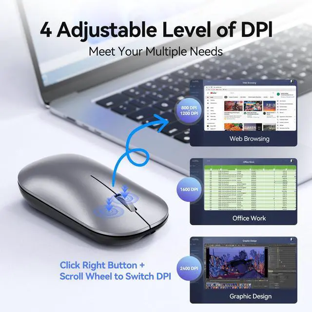 ![Alt view image 4 of 7 - Bluetooth Mouse for MacBook, [ USB + BT5.0 + BT3.0 ] Rechargeable Wireless Mouse, Silent Click, 4-Level DPI, Portable Computer Mice for MacBook/MacBook Air/Pro/iPad/Laptop/Android/Windows](https://c1.neweggimages.com/productimage/nb640/C6FXD26042404NHC5E2.jpg)