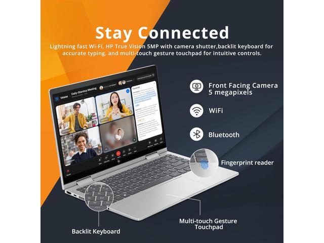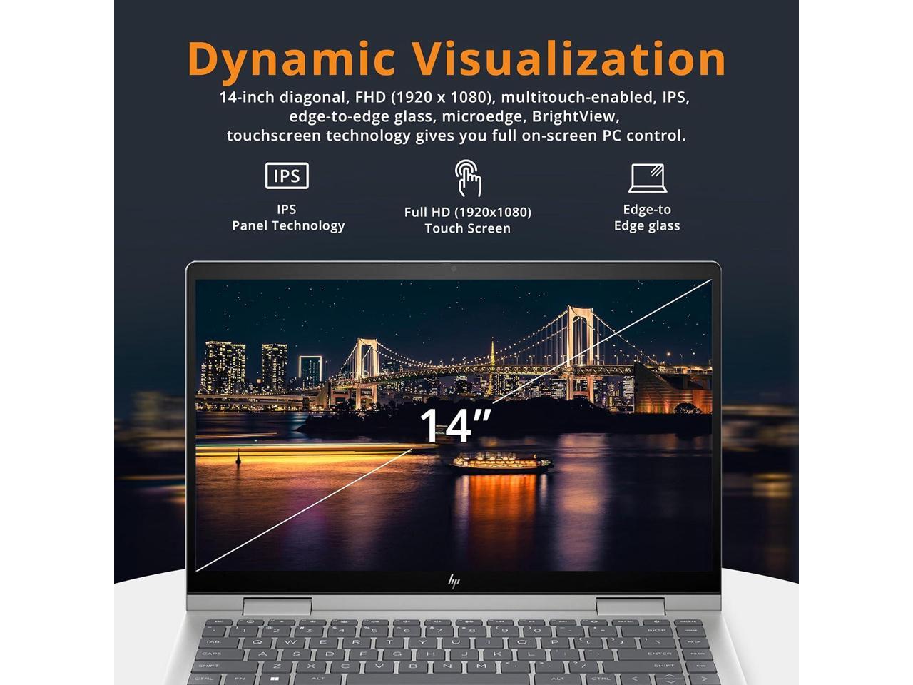 - 14'' FHD IPS TouchscreenEmbark on a visual journey where vibrant colors and high resolution come to life at your fingertips, delivering vivid details whether you are working on a presentation or enjoying your favorite streaming media.2-in-1 Design Convert to a tablet with the flip of a screen around a 360° hinge.