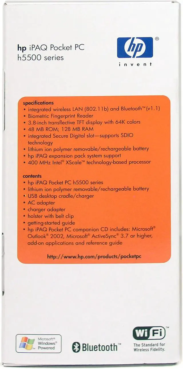 | Software Included | iPAQ Fingerprint Reader: enhanced security iPAQ Task Manager: access and launch programs easily iPAQ Backup: utility for Backup/Restore to Main Memory, Memory Card, or iPAQ File Store iPAQ Image Viewer: view images and create slide shows iPAQ File Store: non-volatile storage in flash ROM Adjustable Standby Settings: utility for adjusting power conservation modes Utilities: Self Test, Expansion Pack, iPAQ Audio, Power Status |