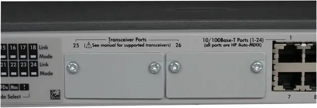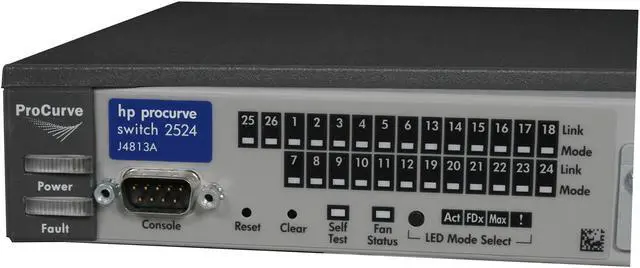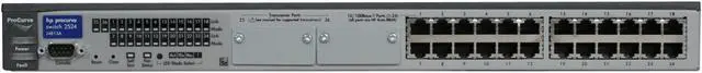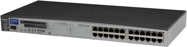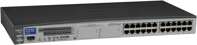 The ProCurve Switch 2524 is a low-cost, stackable, managed 12-port switch with 10/100 auto-sensing per port and 2 open transceiver slots for Gigabit or 100Base-FX. ProCurve Switch 2524 offer ProCurve/IEEE Auto-MDIX on all 10/100 ports, as well as high-availability features.