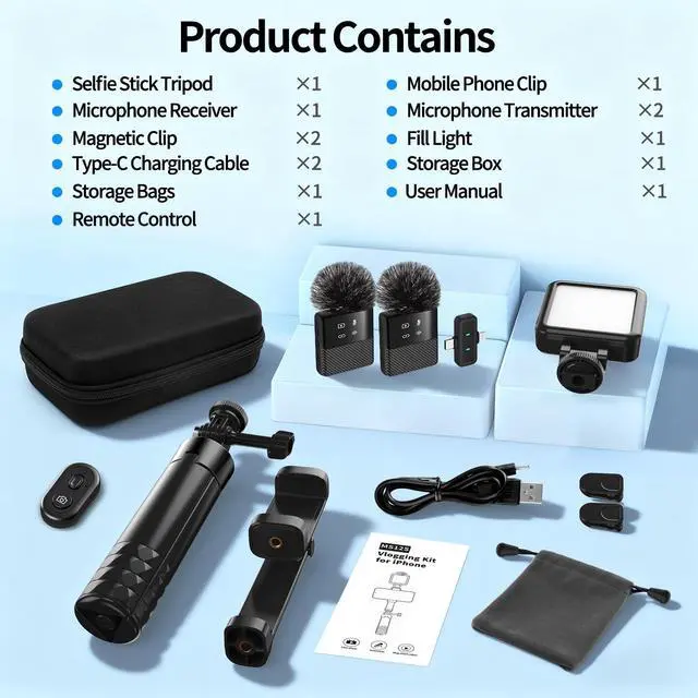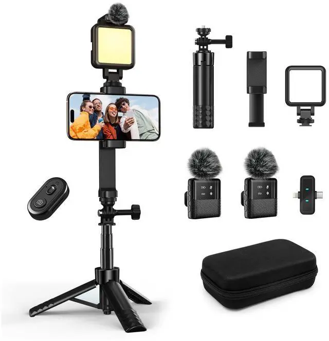 Vlogging Kit for iPhoneThis vlogging kit is designed for content creators and includes: a 2-in-1 tripod, a fill light, a remote control, a professional microphone, and a carrying case. These are ideal for street interviews and outdoor shooting, and are essential professional equipment for shooting vlogs, live streams, interviews, and social media videos, helping you easily start your creative journey and shoot anytime, anywhere.