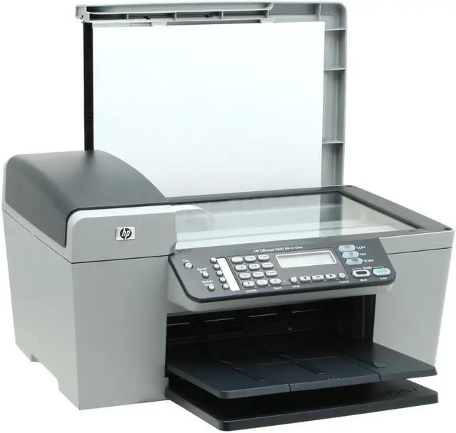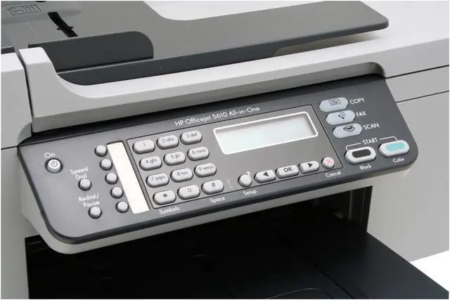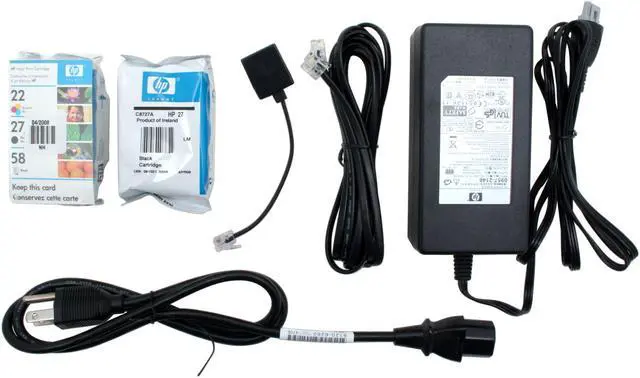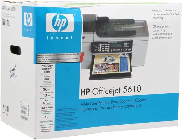 HP Officejet 5610 All-in-One, HP 27 Black Inkjet Print Cartridge (10 ml), HP 22 Tri-color Inkjet Print Cartridge (5 ml), HP Image Zone Photo & Imaging software on CD, Setup Booklet, User's Guide, power supply, power cord, phone cord