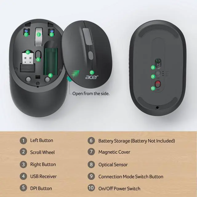 User-Friendly Magnetic CoverThis travel mouse features a magnetic battery cover on the top surface. The snap-on cover aligns perfectly with built-in magnets, allowing quick battery replacement. The sleek, seamless design maintains the mouses aesthetics while enhancing usability. Note: Please remove the battery cover from the left or right side.