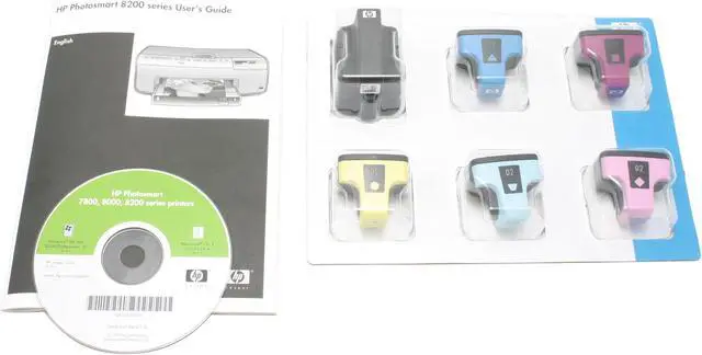 HP Photosmart 8250 Photo Printer User Manual Various Cartridges Power Cord Power Adapter Driver Disk