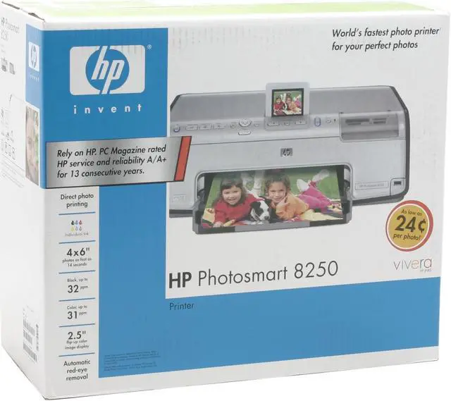 HP Photosmart 8250 Q3470A Up to 32 ppm Black Print Speed Up to 4800 x 1200 optimized dpi (1200 x 1200 input dpi) Color Print Quality USB InkJet Photo Color Printer