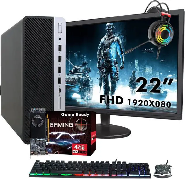 : HP ProDesk 600 G3 SFF Gaming Desktop PC, New 22-inch Full HD Monitor, New Gaming Keyboard & Mouse, New Gaming Headset, Power Cord and Wi-Fi Adapter.